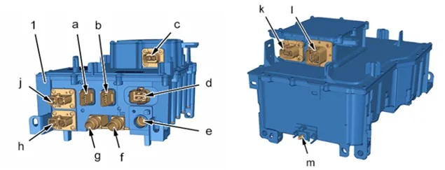 Es gibt insgesamt 12 Anschlüsse. Die Anschlüsse gehören zum Hochspannungskreis, zum Niederspannungskreis und zum Kühlmittelkreislauf. Zur Verdeutlichung ihrer Positionen sind die einzelnen Anschlüsse in Abbildung 5 gekennzeichnet. Die Positionen G und F sind die Kühlmittelanschlüsse. Position M ist für den 12-V-Masseanschluss.